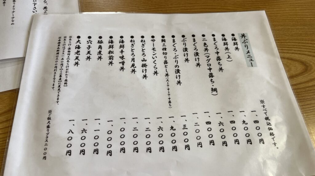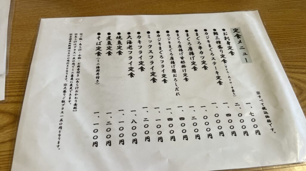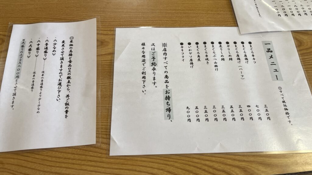 海鮮系のどんぶりや定食がメインで、単品で揚げ物を頼むことも可能。